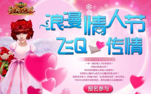 一年一度的情人节即将到来,你想表白吗?你想让TA知道你心中所想吗?《神魔大陆·暮光之城》飞Q传情正式启动,结婚大礼包、完美一卡通、1级自然晶石和独有称号等超多奖励正在等着你,参与就有机会获得哦! 图1《神魔大陆·暮光之城》-页